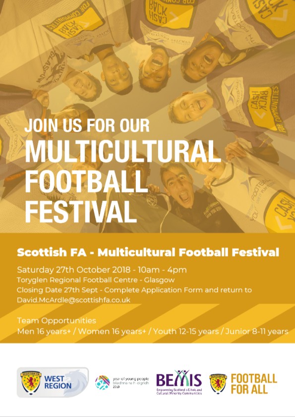 Toryglen Regional Football Centre Prospecthill Road, GlasgowThe Scottish FA and BEMIS ScotlandĀ are delighted to announce the launch the 2018 Multicultural Football Festival which will take place on Saturday 27th October at Toryglen Regional Football Centre in Glasgow. The 2018 festival will bring together teams from across Scotland celebrating diversity and inclusion across the country. The 2018 event will support the Year […]